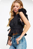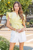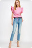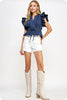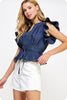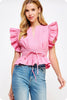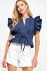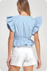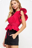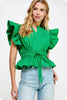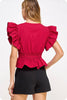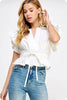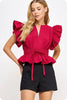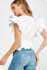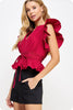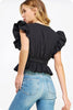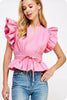 Flutter sleeve peplum top in cotton poplin fabric. This blouse features short fluttered ruffle sleeves with top stitch detail, a split V-neck line, side zipper closure, pintuck detail at shoulder, cinched banded waist with stretch smock at back, and a removeable waist tie. Runs small, size up.