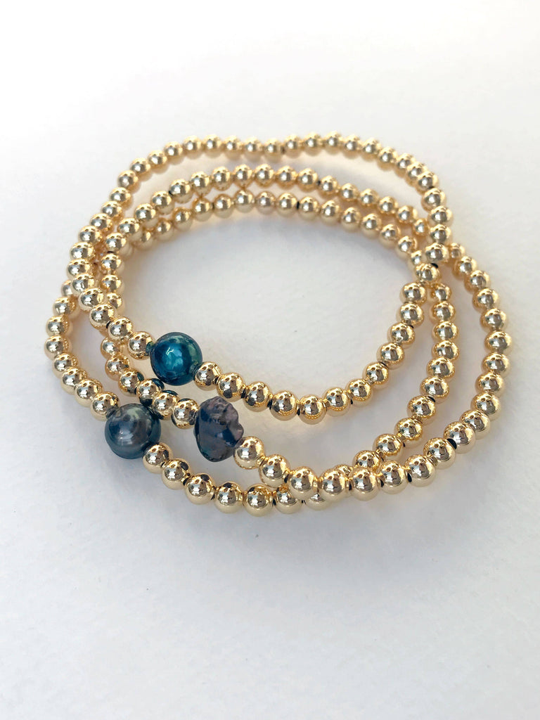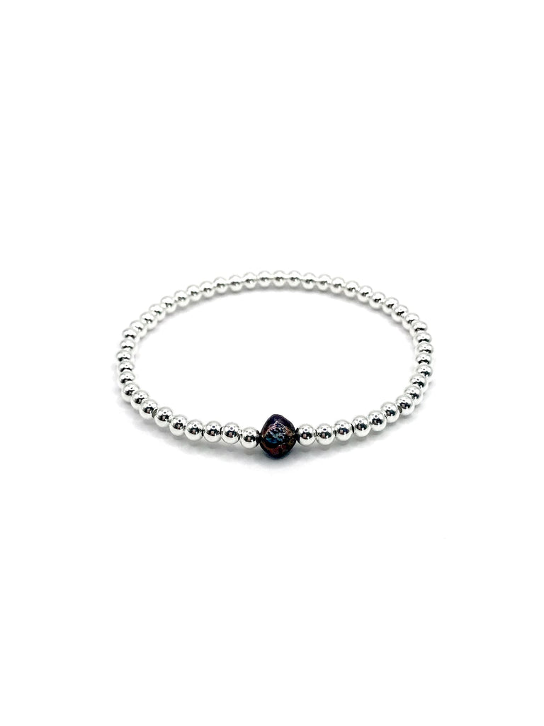 This classic ball bead stretchy bracelet features a single Tahitian pearl, also known as a black pearl. These pearls are cultivated in the islands of French Polynesia, around Tahiti. They symbolize mystery, independence, strength, and riches.